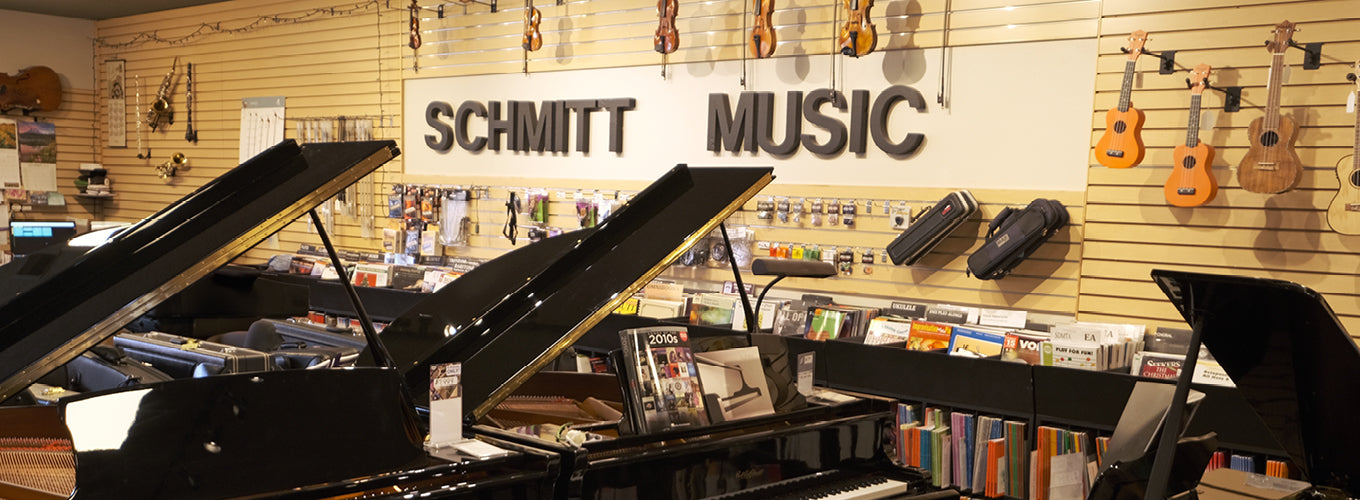 Grand pianos and accessories across the floor. Separate room dedicated to advancing brass, woodwind, and orchestral string instruments.