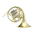 The Hans Hoyer HHG10L2A-1-0 is a Geyer-style F/Bb double French horn with a clear lacquer finish. It is built with a .468″ bore and a 12.204″ bell, and uses four conical rotary valves with a 3B linkage string mechanism. The horn is constructed from yellow brass with a gold brass leadpipe. Design features include a detachable bell, a 3D adjustable finger hook, and an adjustable thumb lever. The instrument is supplied with a lightweight backpack-style case and standard maintenance accessories.
