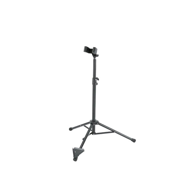 The K&M Bass Clarinet Stand features an adjustable support bracket with variable width and tilt to fit different instruments. Removable rubber pads allow for a customized fit, and a V-shaped base supports the endpin. Felt-lined contact points help protect the instrument, and the stand folds for transport.