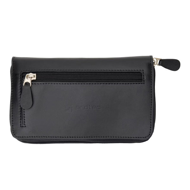 The Protec 4-Piece Leather Trumpet Mouthpiece Pouch combines classic style with functional protection for multiple mouthpieces. Crafted with a durable leather exterior and reinforced stitching, the pouch offers long-lasting reliability with an elegant, professional look. A front zippered pocket provides extra storage for small accessories, and backside belt loops allow hands-free carry by sliding a belt or strap through. Inside, individual padded sleeves cover the full length of each mouthpiece and a soft, non-abrasive breathable nylex lining helps prevent scratches or dents. Grab tabs make it easy to access mouthpieces quickly, making this pouch ideal for musicians who want secure organization with elevated craftsmanship.