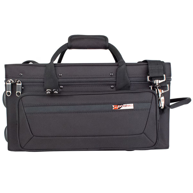 The Protec Cornet PRO PAC Case offers professional-level protection for most cornet makes and models. A weather-resistant 1680 ballistic nylon exterior surrounds a lightweight shock-absorbing wood frame to help guard against impact. Inside, padded velvoa lining with a removable block supports the instrument and accommodates varying cornet lengths. Two quiet, scratch-resistant mouthpiece cups provide convenient storage. Designed for daily use, the case includes a spacious front pocket with an organizer, comfortable carry options, durable hardware, and reinforced protective details throughout. Available in Black.