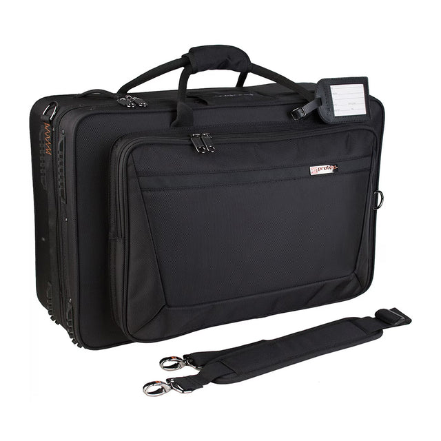 The Protec IPAC Triple Horn Case is a versatile, modular case designed to protect and transport multiple horns and accessories in one unit. Built with a weather-resistant 1680 ballistic nylon exterior and reinforced zig-zag stitching, it combines rugged durability with a lightweight shock-absorbing wood frame. The interior features breathable, padded nylex lining and includes modular walls, fit blocks, and three modular double mouthpiece pouches so you can configure the interior to suit your instruments and accessories. External features such as padded handle wrap, rope handles, metal hardware, QuickLock™ closure, built-in organizer, large front pocket, ID tag, and optional trolley compatibility make travel and daily transport easy and functional. This case fits most Bb trumpet models and can also be customized for piccolo trumpets, cornets, flugelhorns, and accessories such as mutes.