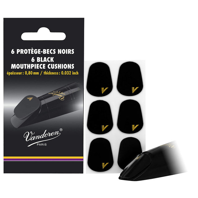Vandoren Mouthpiece Cushions protect your mouthpiece from teeth marks while providing a comfortable playing surface. Made from durable, non-toxic materials, these patches are available in black or clear. Each pack contains 6 patches: black (0.80 mm / 0.032") or clear (0.35 mm / 0.014"), offering reliable protection and extended mouthpiece life.